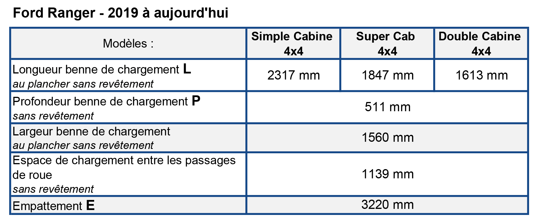| Largeur utile (Centre / Passages de roue) | 1775 / 1392 | 1775 / 1392 | 1775 / 1392 | 1775 / 1392 |